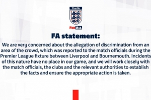 英足总声明:“我们对于在利物浦与伯恩茅斯的英超比赛中,有观众区域传出歧视行为的指控表示高度关注。该指控已在比赛过程中上报给裁判组。”