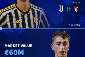 24/25赛季尤文1963万欧出售至伯恩茅斯,现身价6000万欧