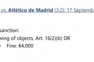 马竞方面,与利物浦的比赛中,西蒙尼与一名在90分钟内持续辱骂他的利物浦球迷发生了冲突,随后吃到红牌。西蒙尼的行为违反体育道德,被欧足联处以欧冠停赛1场的处罚,因此西蒙尼将无法在欧冠主场对阵法兰克福的比赛中现场指挥。
